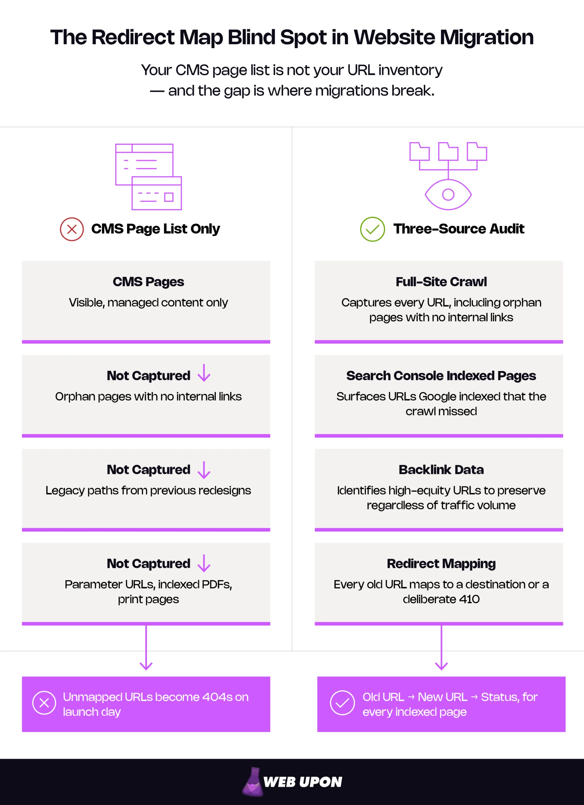 The CMS page list alone won’t save you. Most established sites have hundreds of indexed URLs invisible to the CMS — dynamically generated pages, legacy paths from previous redesigns, parameter URLs, indexed PDFs, images, and print-style pages. If Google indexed it and it carries traffic or equity, it needs a redirect destination.